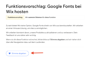 Webseiten bei Wix sind leicht einzurichten und zu verwalten. Dies hat zugleich den Nachteil, dass man nicht in tiefergehende Implementierungen, wie zum Beispiel den Speicherort der Schriftarten, eingreifen kann. Wix hat dazu bereits einen Funktionsvorschlag eingerichtet, damit man in Zukunft alle Schriftarten nutzen kann: Funktionsvorschlag – Google Fonts bei Wix hosten.