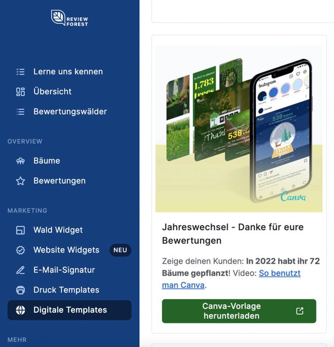 Zum Jahresende stellen wir euch Design-Vorlagen für eure social media Kanäle bereit. Ihr findet sie in eurem ReviewForest Konto unter “Digitale Templates”.