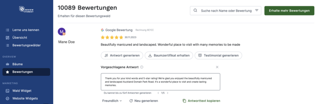 Mit den neuesten Funktionen von ReviewForest kannst du Kunden-Testimonials nutzen, mit KI-erstellten Nachrichten auf Bewertungen reagieren und deinen Beitrag zum Umweltschutz hervorheben.