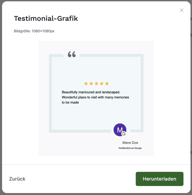 Die Funktion ‘Testimonial generieren’ verwandelt positive Bewertungen in ansprechende Grafiken, die sich für die Verbreitung in sozialen Medien und auf Websites eignen.
