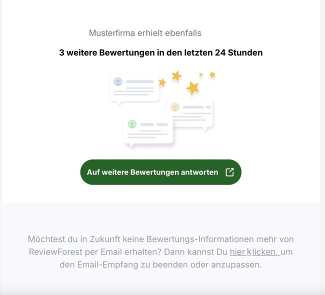 An manchen Tagen kommen gleich mehrere Bewertungen auf einmal. Mit der übersichtlichen Darstellung in der Benachrichtigungs-E-Mail und dem direkten Link zu allen neuen Bewertungen behältst du den Überblick und kannst effizient auf alle eingehen.