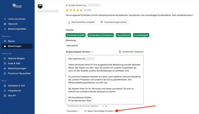 Keine Zeit oder unsicher, wie du antworten sollst? ReviewForest bietet dir durchdachte Antwortvorschläge, die du direkt übernehmen oder an deinen persönlichen Stil anpassen kannst. So sparst du Zeit und behältst dennoch deine persönliche Note bei.
