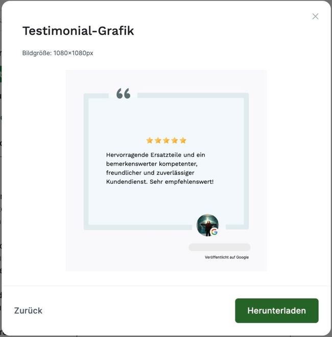 Positive Bewertungen sind Gold wert – nutze sie! Mit nur wenigen Klicks kannst du aus deinen besten Bewertungen professionelle Testimonials erstellen und diese auf deiner Website oder in sozialen Medien teilen. So erhöhst du die Sichtbarkeit deiner positiven Bewertungen und verstärkst ihren Effekt.