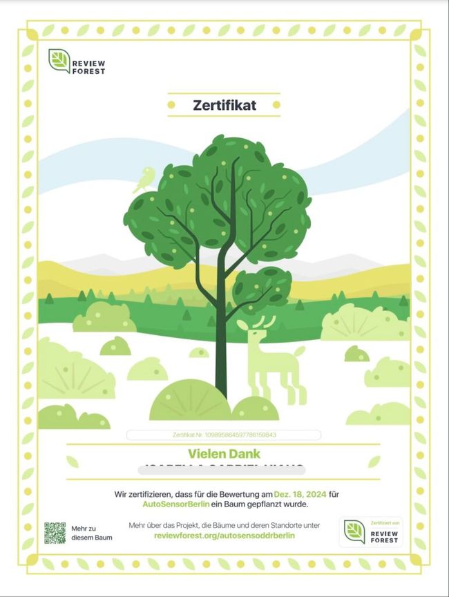 Zeige deinen Kunden, dass ihre Bewertung nicht nur für dein Unternehmen wertvoll ist, sondern auch für unsere Umwelt. Für jede Bewertung pflanzt ReviewForest einen Baum in deinem Namen. Teile das Baumzertifikat mit deinem Kunden und bedanke dich so auf eine besondere, nachhaltige Weise.