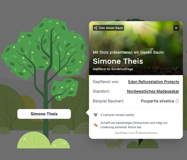 Für jeden neu gepflanzten Baum durch zusätzliche Baumpflanzungen zeigen wir weiterhin den Anlass und den Namen der Person an, für den der Baum gepflanzt wurde. Aber wir haben bei solchen Bäumen, die nicht auf Bewertungen basieren, die Informationen über die Echtheit der Bewertungen gelöscht. Die vorherige Anzeige hat einfach keinen Sinn gemacht 😉