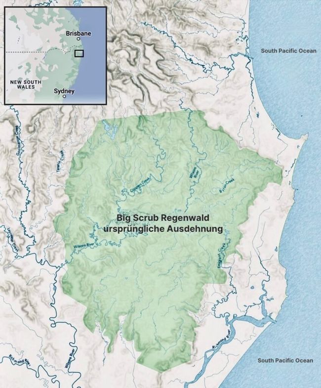 Banyula (“Ort der vielen Bäume”) ist ein umfassendes Wiederaufforstungsprojekt, das sich von den verbliebenen Flächen des Big Scrub Rainforest über das Land der Saratini Farms erstreckt.