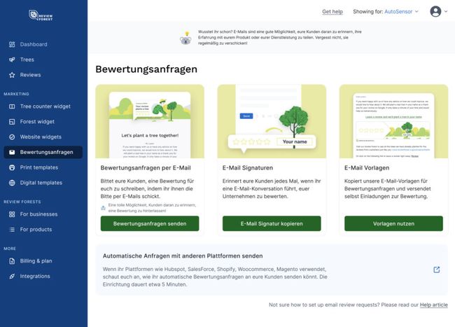 Um eure Kunden zu motivieren und einen Gedächtnisanker zu schaffen, euch zu bewerten, könnt ihr ReviewForest nutzen. Bei ReviewForest pflanzt euer Unternehmen im Namen eines jeden Bewertenden einen Baum. Die Bäume kommen dabei allen zugute und stellen keinen finanziellen Anreiz für einen einzelnen dar. Ihr helft damit der Umwelt und motiviert eure Kunden, eine Bewertung zu schreiben – ohne gegen Google’s Richtlinien oder das Gesetz zu verstoßen.