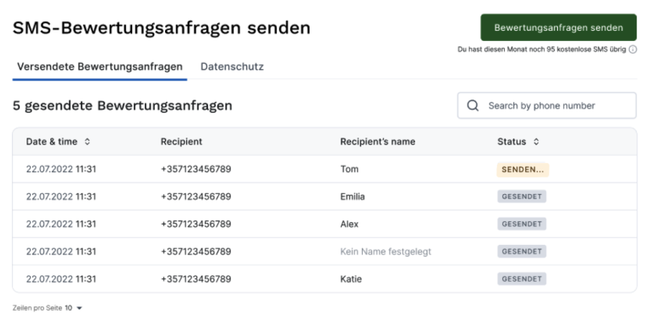 Eure Übersicht zu bereits gesendeten SMS gibt euch Auskunft über den Status der versandten SMS-Bewertungsanfragen, so dass ihr immer alles im Blick habt.