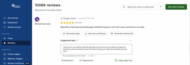 With the latest features from ReviewForest, you can use customer testimonials, respond to reviews with AI-generated messages, and highlight your contribution to environmental protection.
