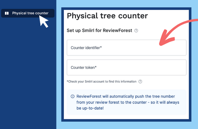 - In your ReviewForest account, go to the “Physical Tree Counter” section. Here you will see an input mask. The data that is asked for can be found in your Smiirl account.