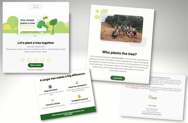 Each email includes an invitation to leave a review for your business or product. Furthermore each email motivates with interesting facts about trees and why it’s so important to plant them.